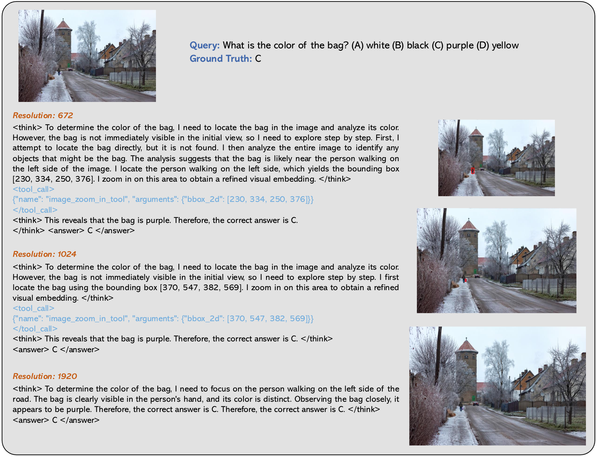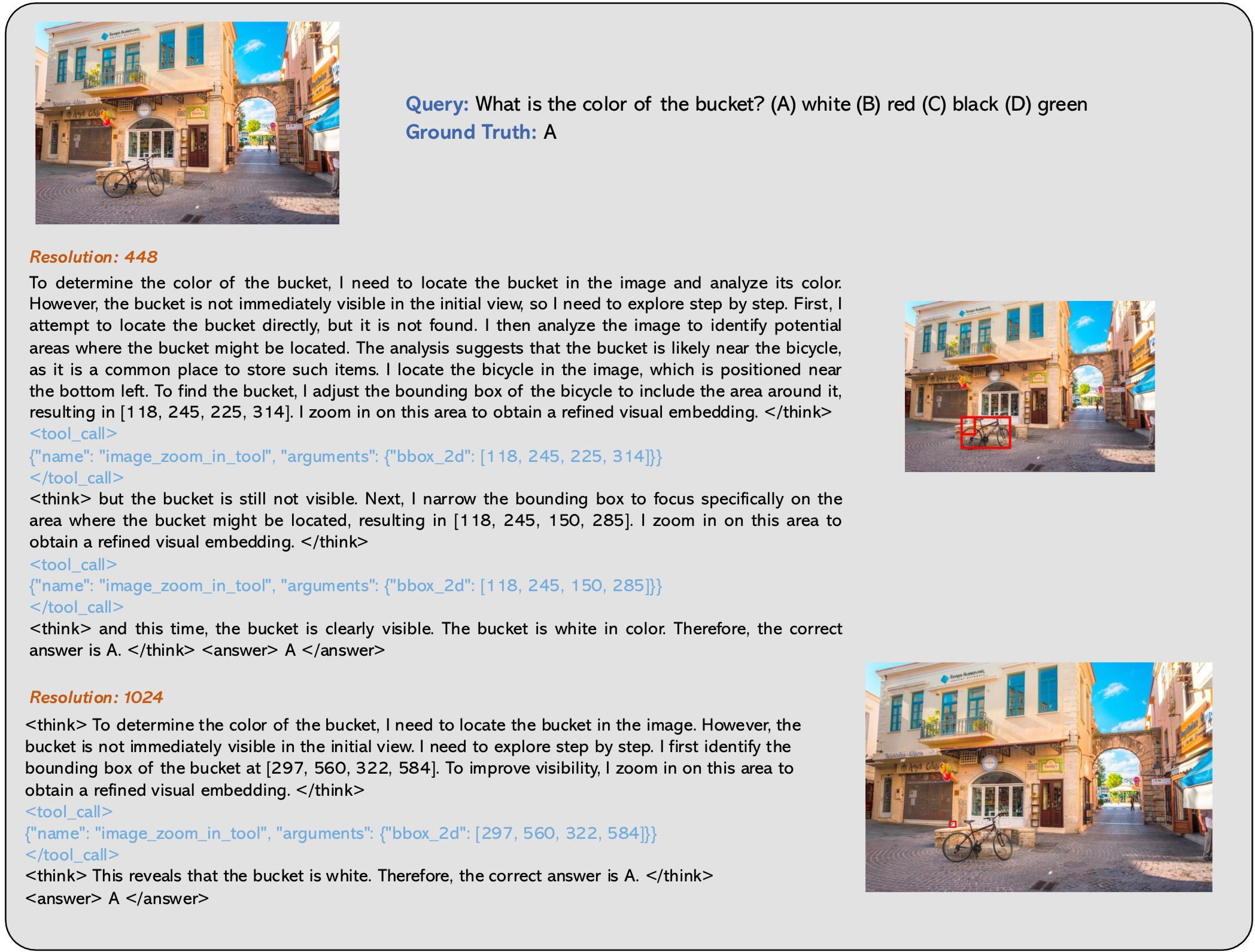 In the RL stage, we leverage the outcome accuracies and formats as rewards to update the VLMs, enabling further refining the model’s search and reasoning strategy without human priors. We denote the obtained model as Qwen2.5-VL-7B-CoF.